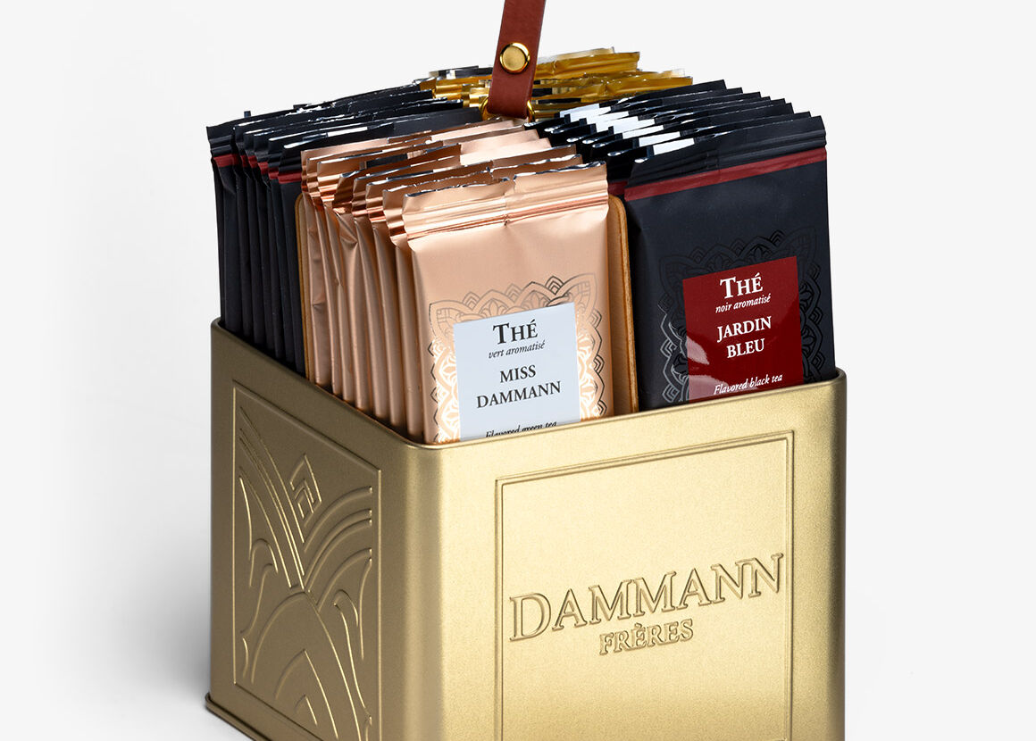 Box mit 32 einzeln verpackten Cristal®-Beuteln, die jeweils 8 Beutel der folgenden Sorten enthält: Grand Goût Russe, Jardin Bleu, Miss Dammann und Thé vert à la Menthe.