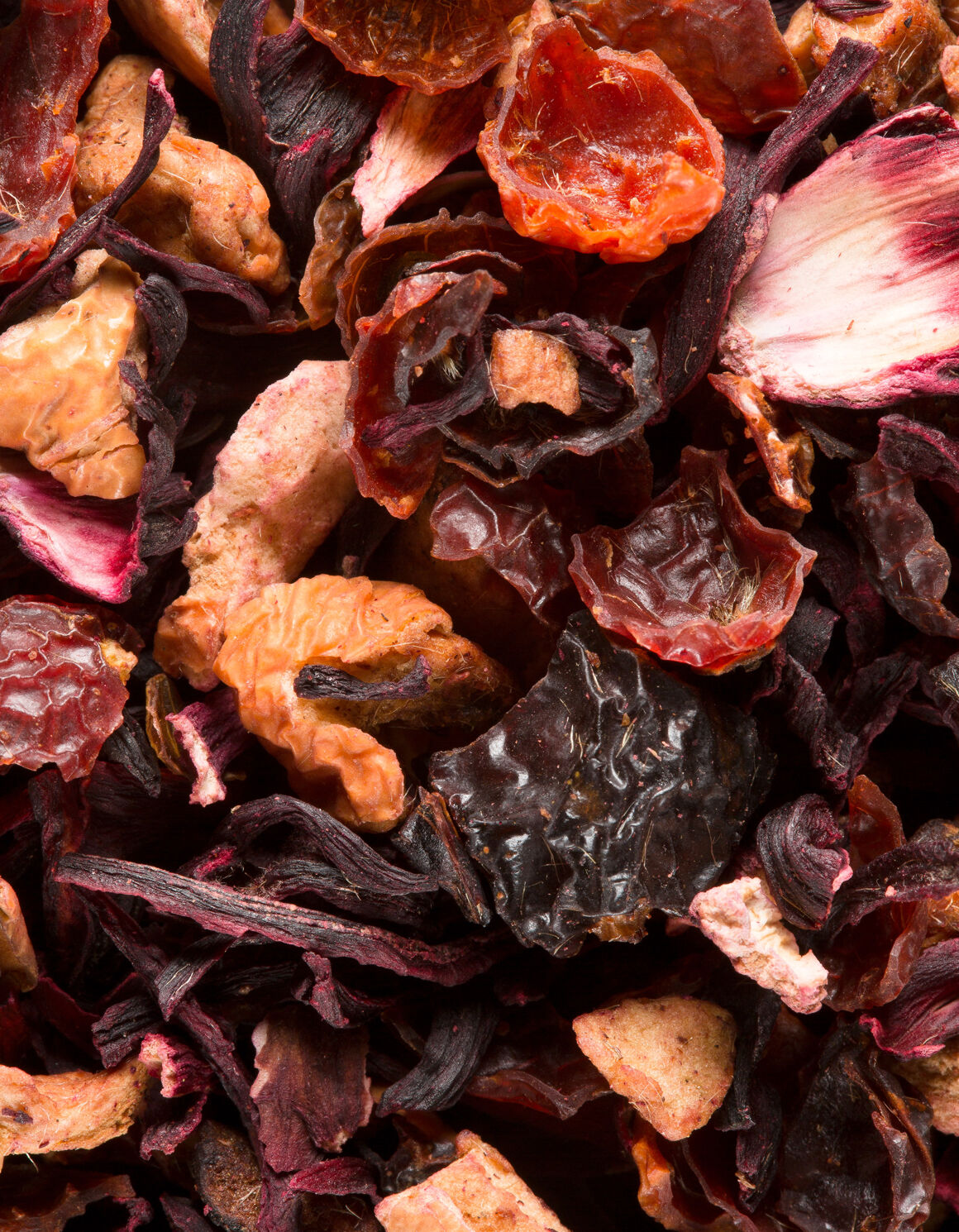 Mischung aus Hibiskusblüten, Apfelstücken, Hagebuttenschalen, Aromen von Himbeere, Erdbeere und Sahne.