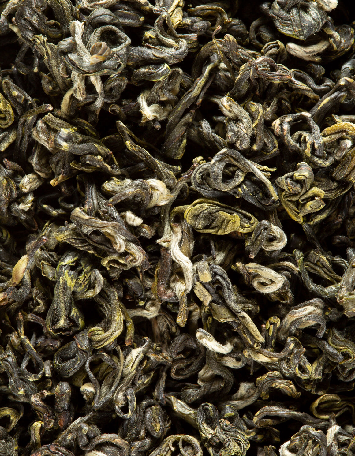 Kleine jadefarbene Perlen aus Guangxi (Südchina). Die Rolltechnik erinnert an die des Gunpowder, hier findet mit der ganzen Subtilität eines Frühlingstees. Die aufgegossenen Blätter sehen zart aus und ergeben eine frische, fruchtige Tasse.