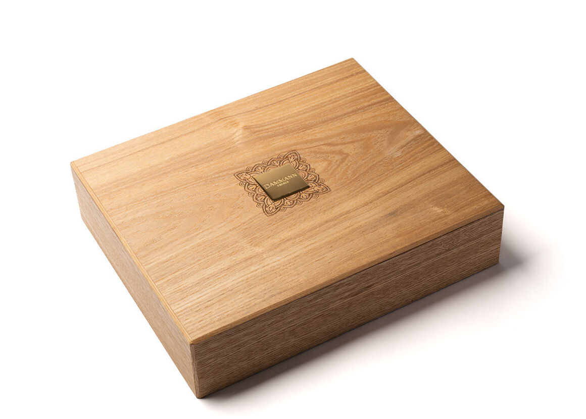 Light wooden box wood with brass plate on lid with interior of natural.Interior equipped with 8 compartments for 48 enveloped Cristal® sachets.