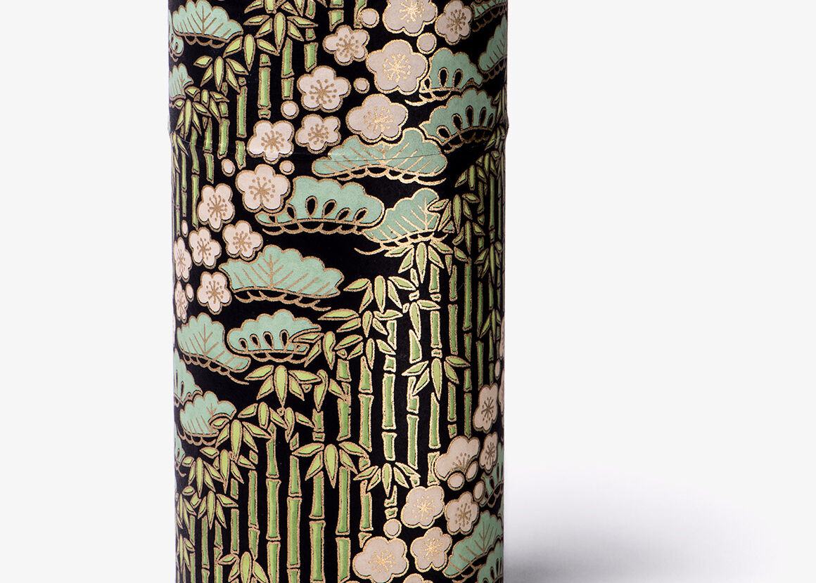 Hecha a mano en Japón, esta lata de té está recubierta de papel washi, fabricado con fibras de morera. Papel con un diseño estilizado sobre fondo negro, con motivos de bambú, flor de cerezo y loto en una espiral vegetal.