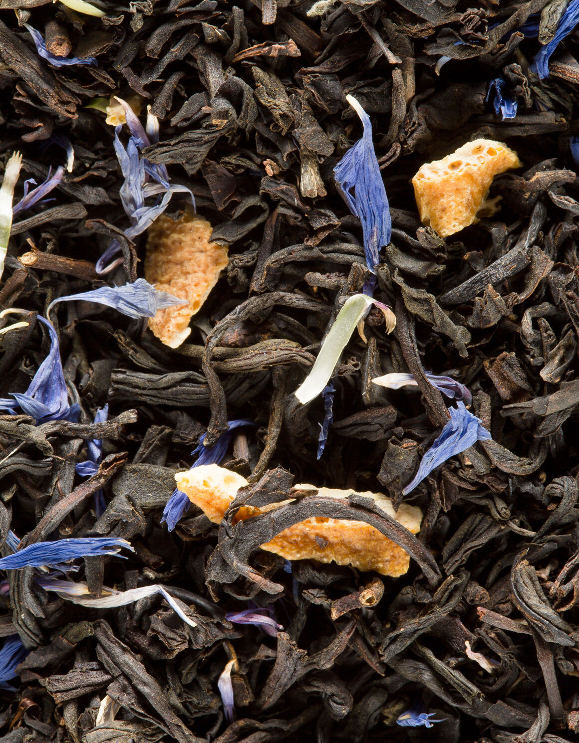 Mélange de thés noirs délicatement aromatisé aux huiles essentielles d'agrumes : bergamote de Calabre, orange douce et citron vert d'Italie. Agrémenté d'écorces d'orange et de fleurs de bleuet.
