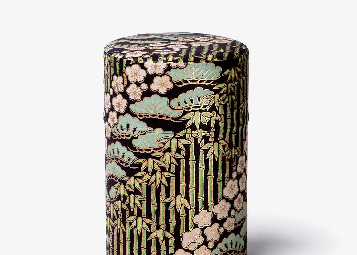 De fabrication artisanale cette boîte à thé du Japon a été recouverte à la main de papier washi, un papier fabriqué à partir de fibres de mûrier. Un papier au décor stylisé sur fond noir rassemblant dans une spirale végétale, bambou, fleur de cerisier et de lotus.