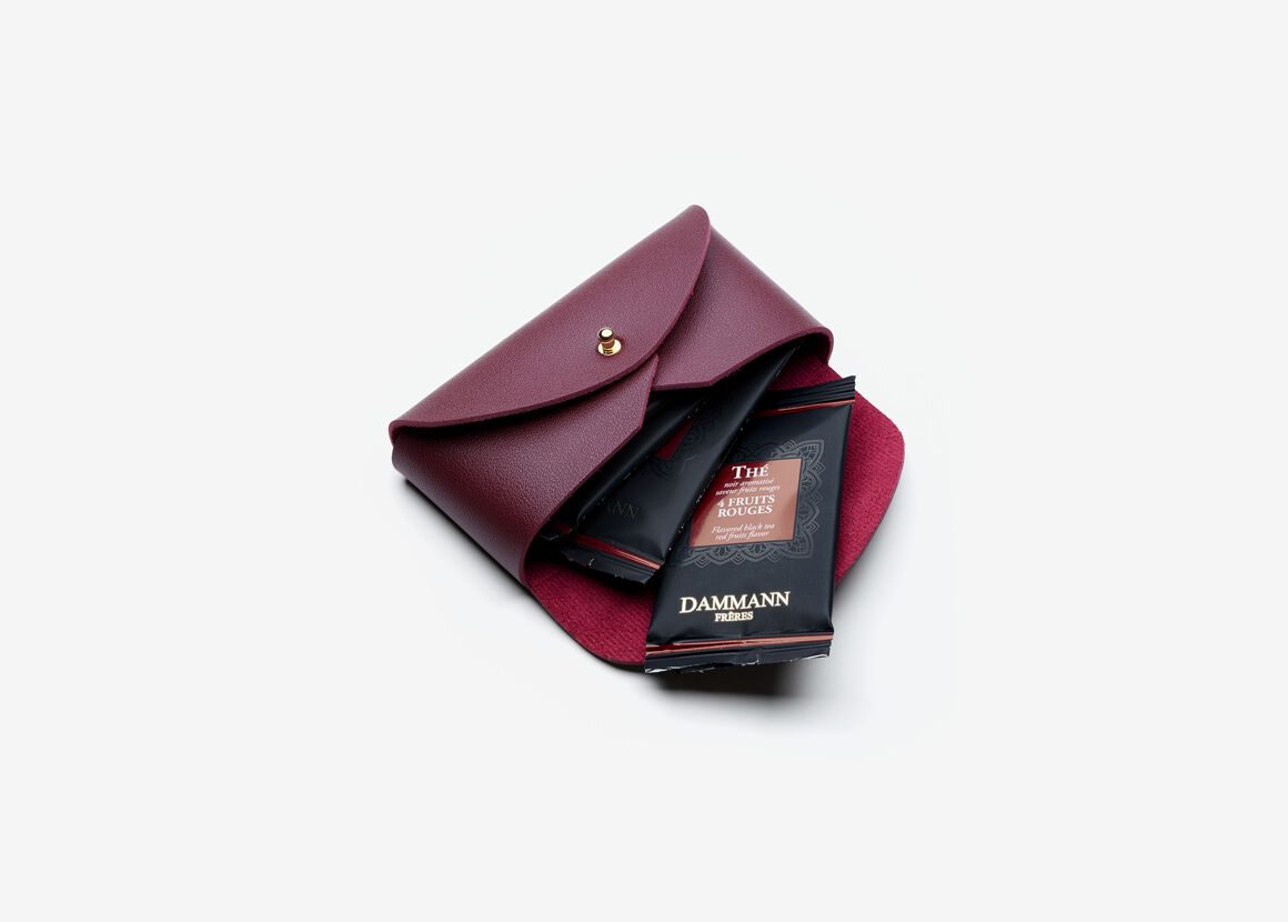 Pratique, cette pochette porte-sachets se glisse facilement dans une poche, dans un sac à main, dans un bagage…Elle est à garnir de quelques sachets du thé de votre choix pour profiter partout et en toute occasion, d’un instant thé à votre goût (jusqu’à 6 sachets). Pochette réalisée en cuir synthétique avec bouton de fermeture en nickel.Se nettoie avec un chiffon humide. Dimensions : L/H/P : 12/4/6 cm. Pochette porte-sachets disponibles en plusieurs coloris.